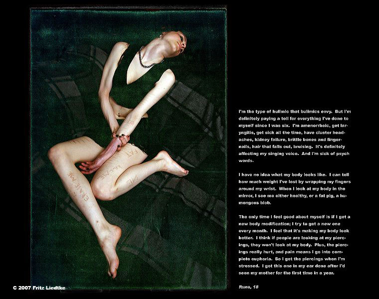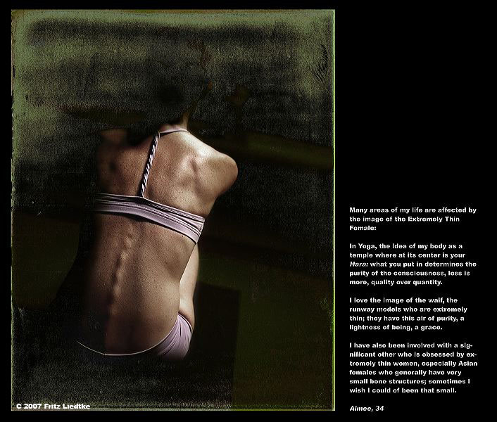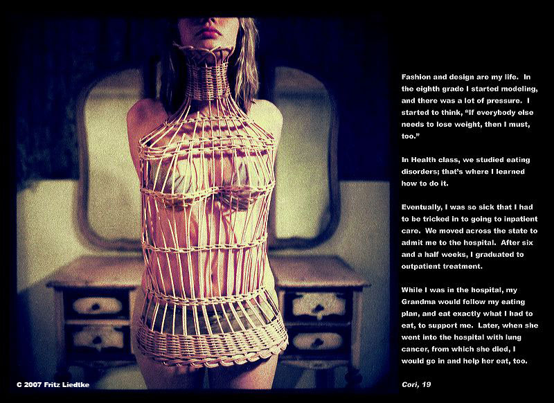 Skeleton in the Closet Ordinary People, Disordered Eating Photographs by Fritz LiedtkeThe woman looking at these photographs paused, closed the book. “It’s true,” I replied. “Some of these men and women are healthy now. Some are very sick, and yet look healthy. Some, even with anorexia and bulimia, can be quite heavy. And some people who look quite normal—people you know, even—have an eating disorder in their history.”I’ve seen thinner. We all have: the emaciated frames, the walking skeletons, the naked bones, the withering models. We’ve all seen these shocking, grotesque images, and there are enough of them in the world. The men and women in this series have looked this way before; some still do. Beneath the layers of clothing and confusion is skin stretched over bones, which they are loathe to reveal. They have, as it were, a skeleton in the closet.These photographs are about normal people, people like me. I attended college right out of high school. During that first winter away from home, I began to find myself depressed, lonely, and in poor physical condition. This went on for some time until, finally, at the college nurse’s suggestion, I went to talk with someone in the counseling center. The gentleman there was gracious, asked good questions, and listened well. Over the course of the next few months, we were able to unravel the tangle of my thinking, and along the way discovered that, among other things, I was anorexic.That word hit hard. I had never really thought about anorexia, and certainly never thought of myself as someone susceptible to it. I had assumed such eating disorders as anorexia and bulimia were for women who didn’t like their appearance. With some research, however, I discovered that anorexia is more about issues of control, which did apply to me. I was a quiet, intelligent achiever, and I didn’t want anything to get in my way—least of all food and thoughts of food.This body of work is about normal people, who sit down with me over coffee, and pour out their secrets: abuse, neglect, insecurity, cruel and thoughtless words, terrible things they’ve done to their bodies and families, the results, the healing process, the enduring ache within. They tell me—a complete stranger—things they have told no one else. I am their confessor, their confidant, their priest.“I’ve seen thinner” isn’t just a phrase uttered by those who view this work; it is the mantra of those who suffer from eating disorders. It is their constant obsession, the drive behind their heroically intense efforts to control their lives and minds and bodies. They’ve seen thinner models, actresses, parents, friends; they’ve seen themselves thinner when they were younger; they’ve seen thinner clothes; they want to fit in. They want it so bad, some are willing to die for it. Even the briefest perusal of pro-anorexia literature reveals how driven and competitive and disciplined and anxious these sufferers are. Their walls are plastered with glossy prints of thin models, their floors littered with magazines, diet books, exercise equipment, and scales. They’ve seen thinner, and it is their promised land, just a few more pounds away.In a society saturated with shallow, narrow definitions of beauty, anorexia is an increasingly prevalent trend. Movie stars, magazine ads, Atkins diets, internet pornography, fashion models, MTV… the pressure to look thin and attractive is an oppressive force that is increasingly difficult to resist. Everyone wants to be an American Idol. And obsession with appearance is not the only motivation for restrictive eating. Dancers, gymnasts, wrestlers, and other athletes find themselves in unhealthy eating patterns in order to stay competitive.Conservative estimates suggest that three out of every one hundred Americans have eating disorders. Approximately 8 million women and girls and 1 million men and boys suffer with anorexia in the United States alone. While anorexia affects females from 6-76, it is primarily confined to the domain of adolescents. One percent of female adolescents in America—one in one hundred—struggle with it.Bulimia affects another 1% of American women. Four percent of all college age women struggle with this disorder; 30% of all American women dieters practice binge eating.These disorders are a silent epidemic; they are rarely discussed, fraught with shame, and often go undetected in those who suffer with them. Of those who do not seek treatment, twenty percent may die.In the end, however, anorexia and bulimia are not about numbers, percentages, and statistics. They are about individual people, each one with a name and a face and a home, struggling for control over their bodies and minds and lives. Their stories include, of course, their families and friends, their counselors and classmates, their spouses and children. These are the stories I want to tell. With respect and compassion, I want to tell the truth.