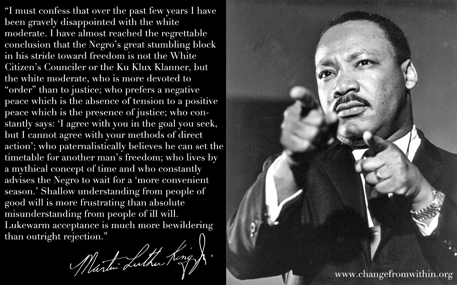 The cracking of my own heart's shell of ignorance and laziness, my slow awakening to my own responsibilities on these matters, is a fairly recent thing and it has only just begun. I've begun to see how, in my fear and shame, I was part — am still part — of the force causing the most disruption in God's order, while the protestors are those bringing evidence of the Kingdom of God. I'm still prone to error and to inaction. So it's best if I just hand the mic to my superior, my mentor, my teacher. Martin Luther King Jr. saw right through us, and he described our willful ignorance so well here, in Letter from a Birmingham Jail.