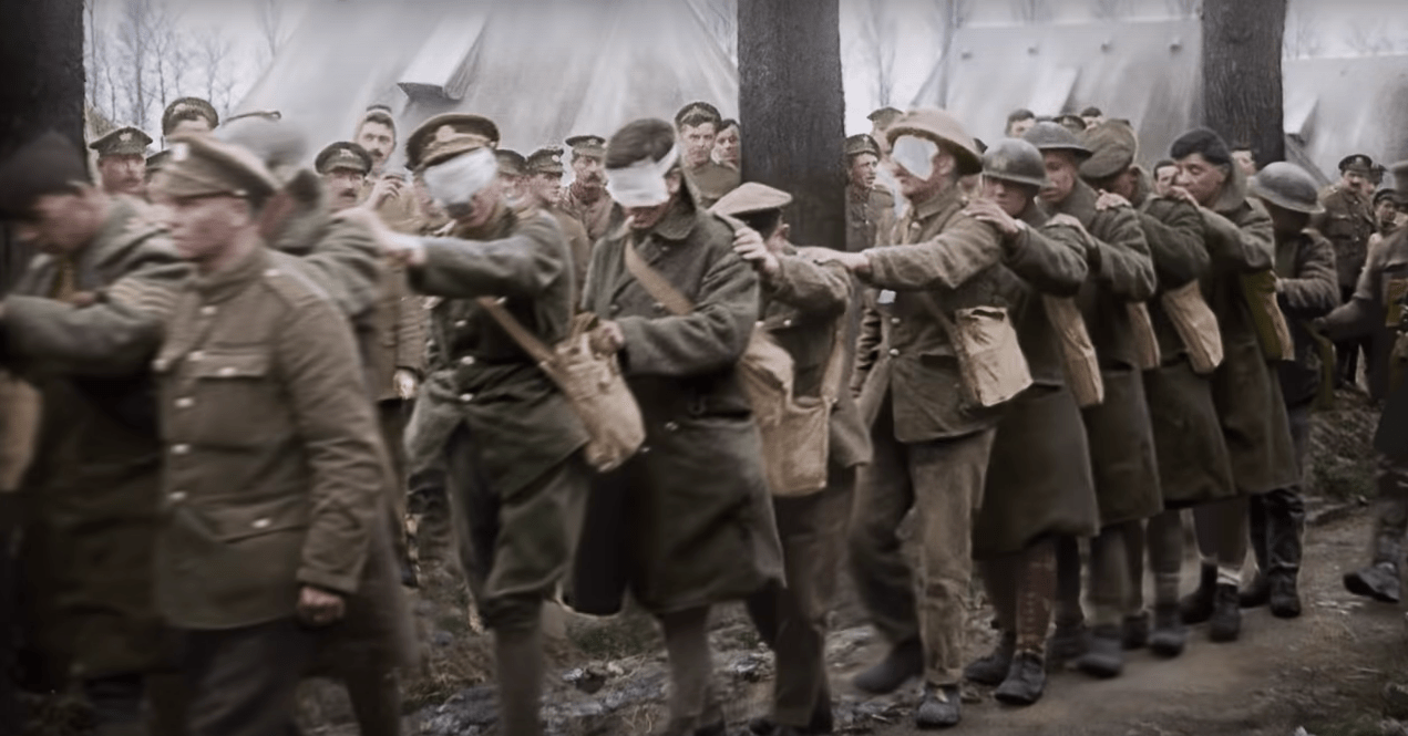 The footage casts no doubt on the grim and grisly testimonies. I know that much of this imagery has been easily accessible for many years, but it is another thing to see it on a grand scale, so carefully restored, so wisely organized and edited. I won't soon forget the stories or the images: Bodies bent at unnatural angles. The mud that swallowed soldiers whole. A parade of men in blindfold-bandages suffering from mustard-gas blindness. Vast fields of dead rats. As we look back at gazes both solemn and snarky, frightened and fierce, we're often aware that a soldier's expression was one of the last pleas or semblances of strength he ever expressed.