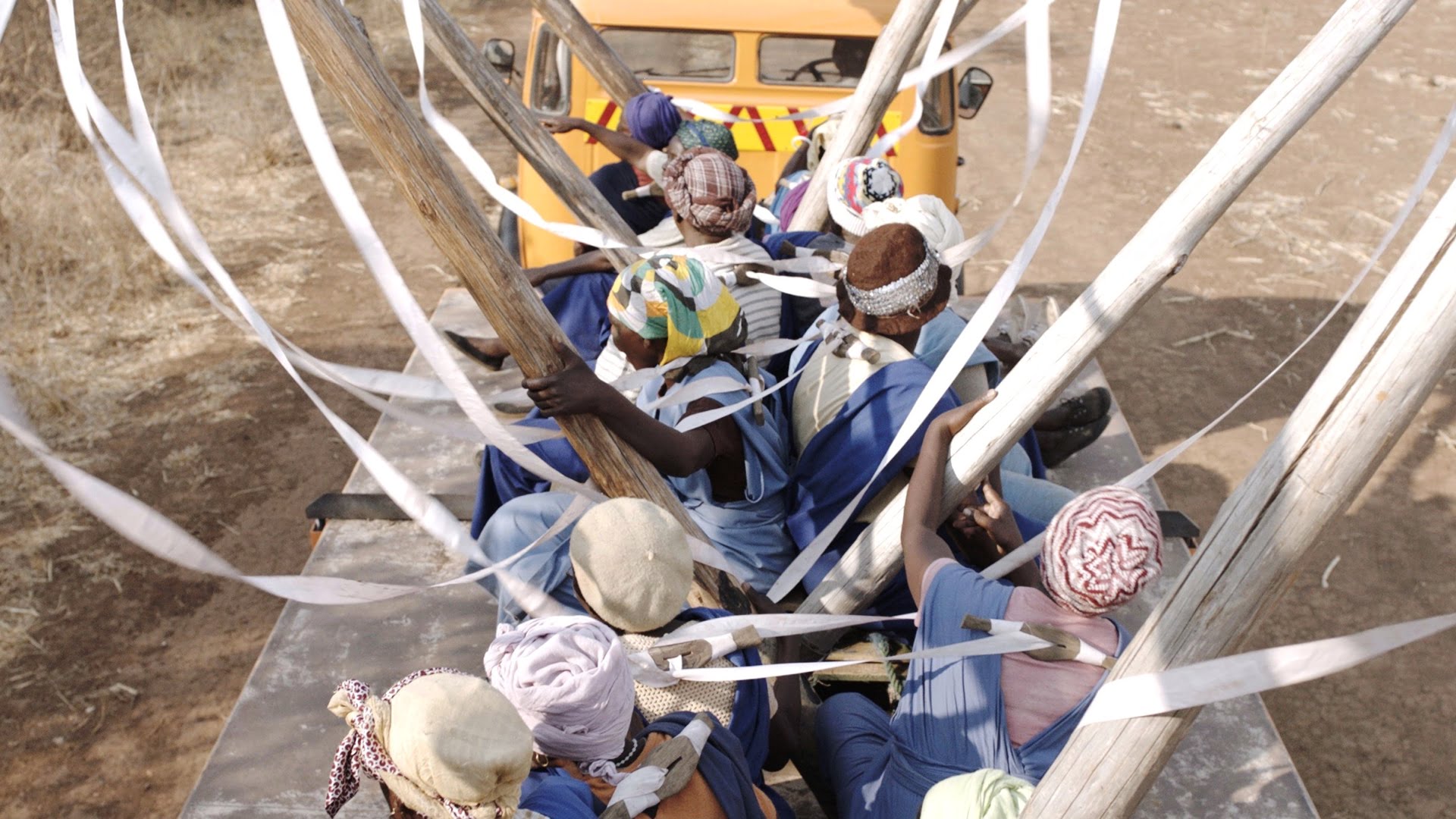 In what some critics are calling "an absurdist comedy" (but is it absurd?), you'll see not one but many Zambian women who, convicted — on hearsay, not evidence — of practicing witchcraft, have been sentenced to communal imprisonment in a camp, each one bound by a long white ribbon to a large spool. The ribbons are tethers, lines that will prevent them (we learn from a tour guide addressing wide-eyed tourists) from flying around over Zambia and casting curses down on the locals.