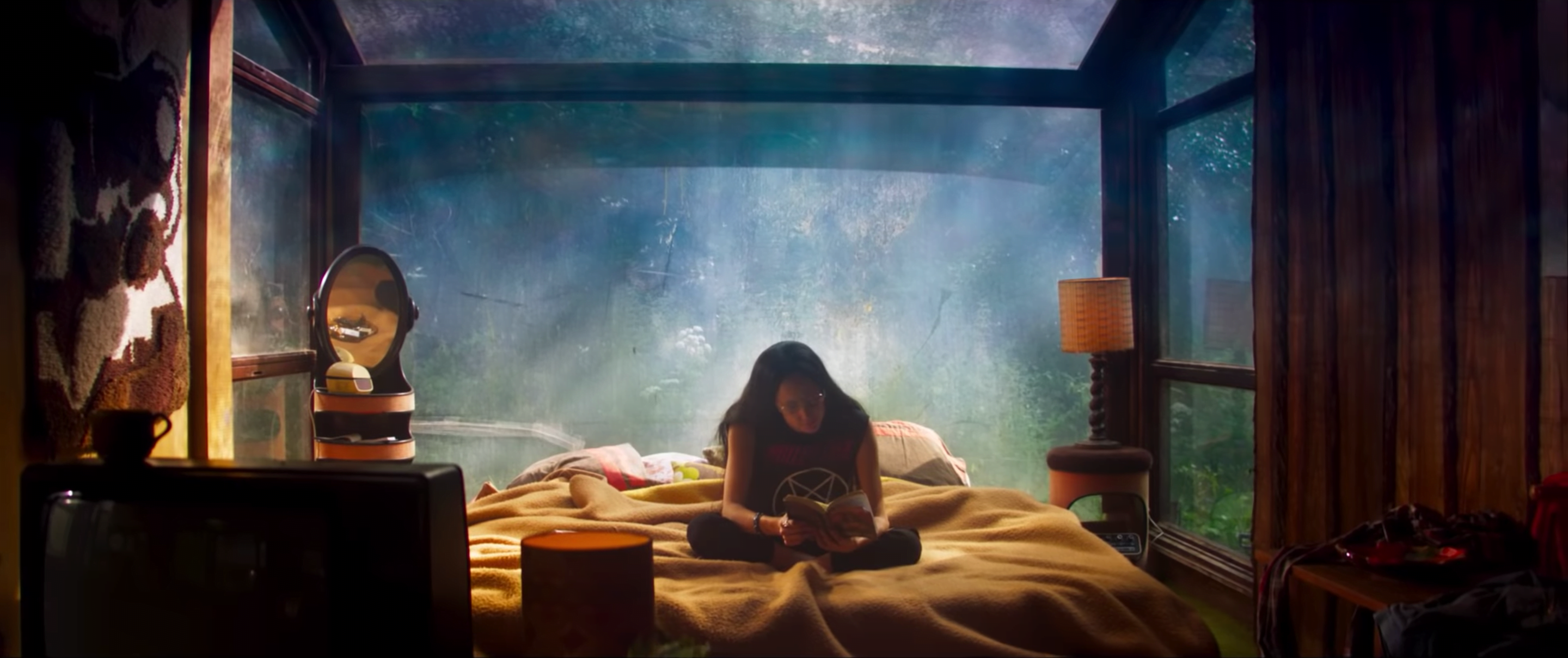 Here's the bloody scoop: It's 1983. Red and his lover Mandy live in isolation, deep in the woods, like that doomed family in Robert Eggers' The Witch. Mandy likes it there — she can wander around in her Black Sabbath t-shirt, read pulp-y fantasy novels, and paint imagery in the style of old fantasy paperbacks and early '80s heavy metal album covers. (It's that very specific kind of pulpy fantasy-novel kitsch that you sometimes see on t-shirts, posing flamboyantly naked women against images of eagles and mountain lions.) Red clearly worships her and finds something meaningful in her art — it's good that somebody does, I guess. He comes home from hard days of forestry to adore her, to stand slack-jawed before her artwork, and to ride Mandy's rollercoasters of conversation from the playful ("What's your favorite planet?") to the disturbing ("My father taught us to kill baby birds!").