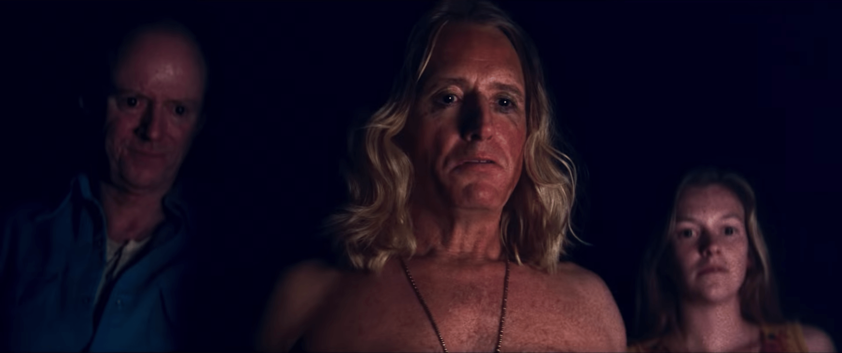 And there are monsters in these woods. More specifically, there's a cult roiling around a self-proclaimed I'm-Better-Than-Jesus messiah: Jeremiah (Linus Roache, committed fully — and full-frontally — to this madness). His entourage is made up of a bunch of dangerous idiots who resemble expendable bad guys from leftover Twin Peaks episodes. Apparently altered by botched batches of drugs, these willing disciples have dedicated themselves to appeasing Jeremiah's insatiable appetite for appetites for psychotropic drugs, sex slaves, and Hard-R-rated blood. (The movie's promotion has made its simplistic revenge plot clear, although Red doesn't have a reason to wreak bloody havoc until almost an hour into the movie.)