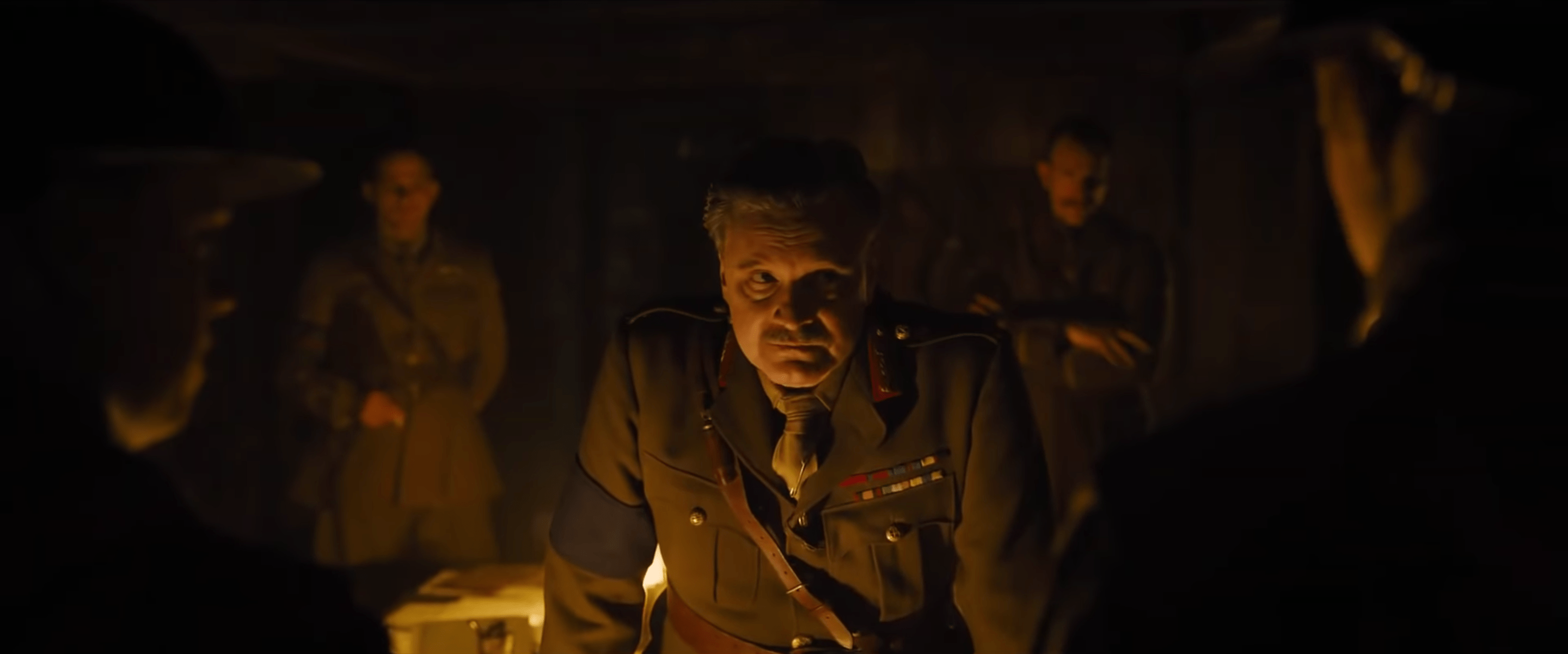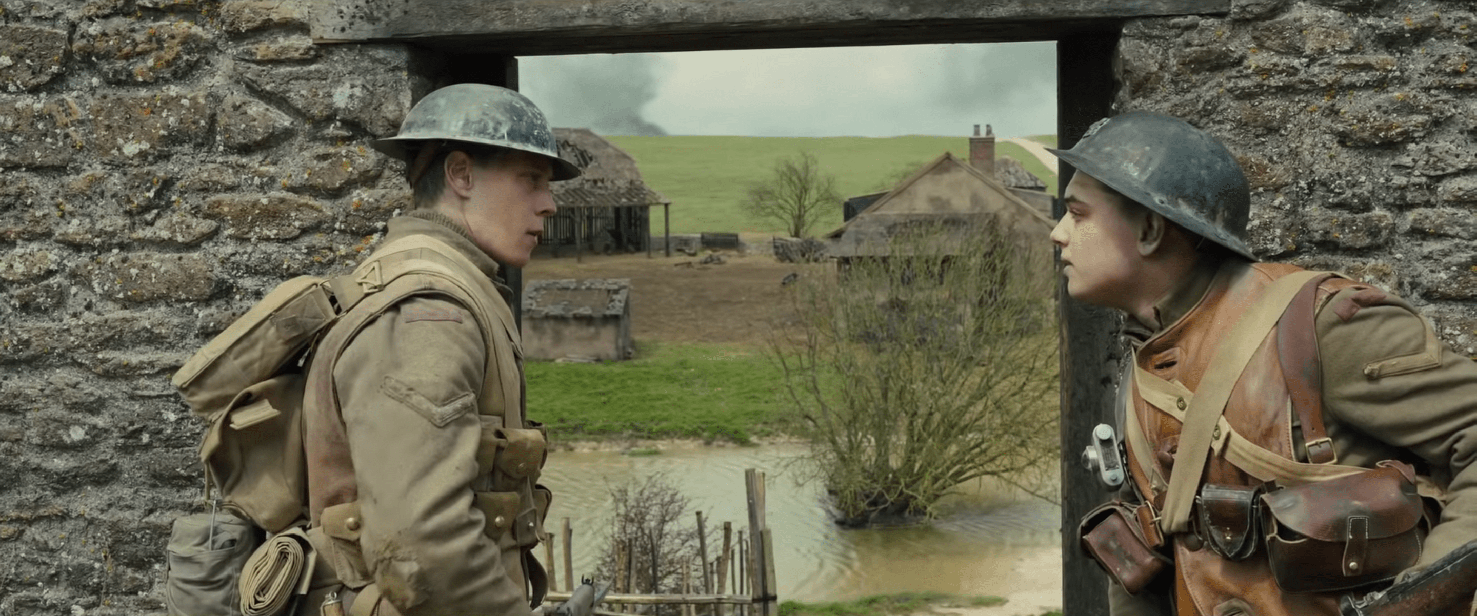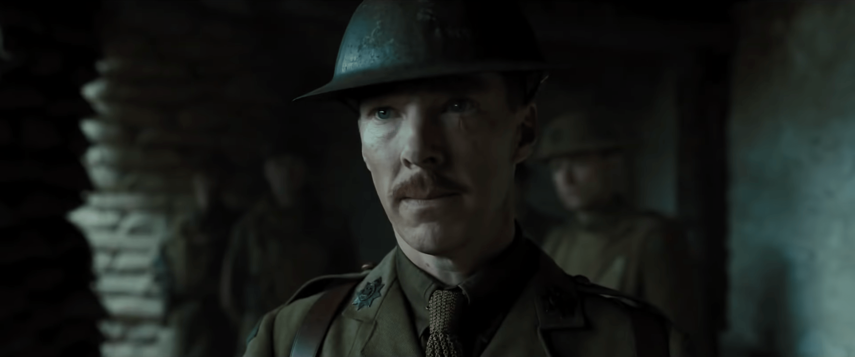 I couldn't help but think about Frodo and Samwise of The Lord of the Rings as I watched our two anxious heroes — Lance Corporal Will Schofield (George MacKay) and Lance Corporal Tom Blake (Dean-Charles Chapman). They made me think about the World War One troubles suffered by British soldiers who turned their stories into art: J.R.R. Tolkien, C.S. Lewis, and Richard Adams, in particular. It was easy for my mind to wander as these faint sketches of characters received their orders from One Famous British Actor (Colin Firth as General Erinmore) to venture into enemy territory and prevent many hundreds of other British soldiers, led by another Famous British Actor (Benedict Cumberbatch as Colonel Mackenzie), from advancing into a trap.