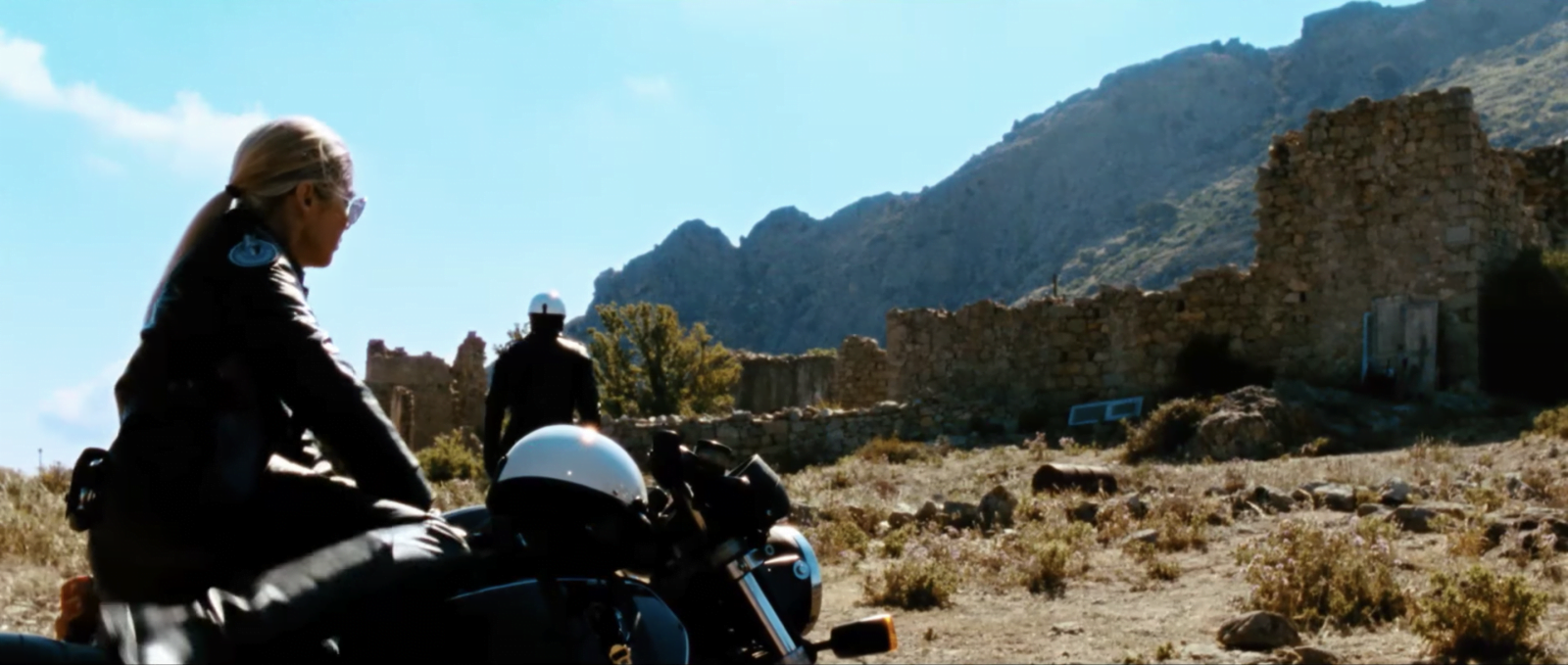 The story... yeah, okay: As best as I can understand it, this is a movie about half-mad painter named Luce who lives in the ruins of a Catholic church — or, perhaps, a convent — on a sun-baked Italian island, where she splatters her canvases with violent expressions, incorporating, for example, bullet holes. She surrounds herself with glowering thugs — for inspiration, I suppose — who are distracted by their plots in progress. We watch some of them rob an armored car and then, as they throw bodies in the trunk and retreat back to the commune, they end up reluctantly giving a ride to desperate strangers: two women and a child.