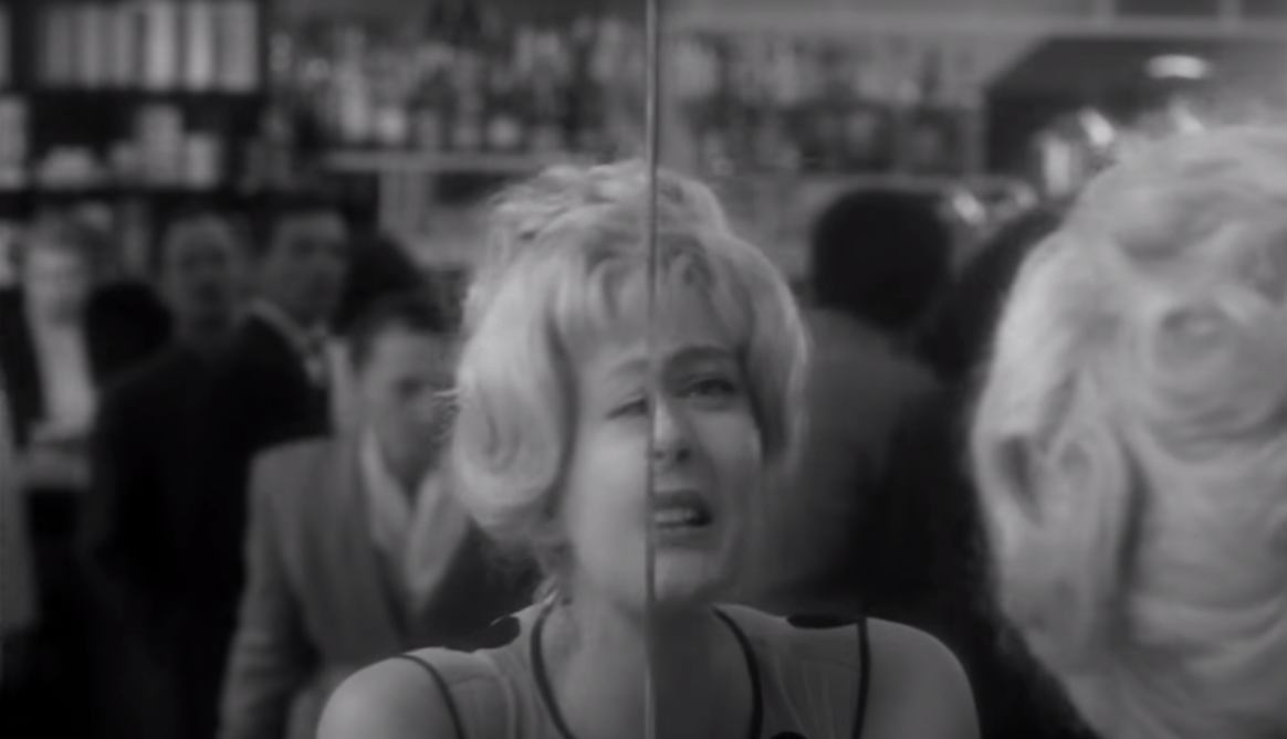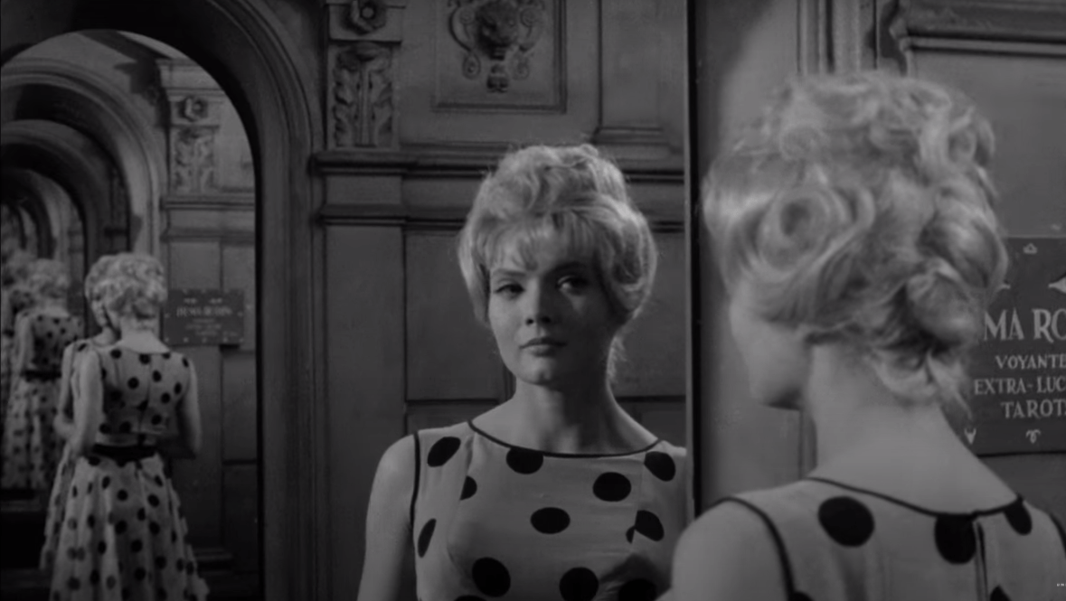In its visually entrancing first hour, we follow Cleo (Corinne Marchand, radiant and funny) as she zigzags from one possible "escape" after another — dazzlingly choreographed scenes full of mirrors and window reflections, a world that represents her self-obsession and self-absorption, of appearances and illusions. But it's also a world that seems designed to condition her to believe that appearance is everything. "As long as I'm beautiful, I'm alive," she says, and the men cat-calling her seem to agree. At times she seems distracted and even annoyed by the constant attention of strangers. But when her fears agitate her, she'll walk into a busy cafe and set the jukebox to playing one of her songs as if eager for people to remind her of her own importance.