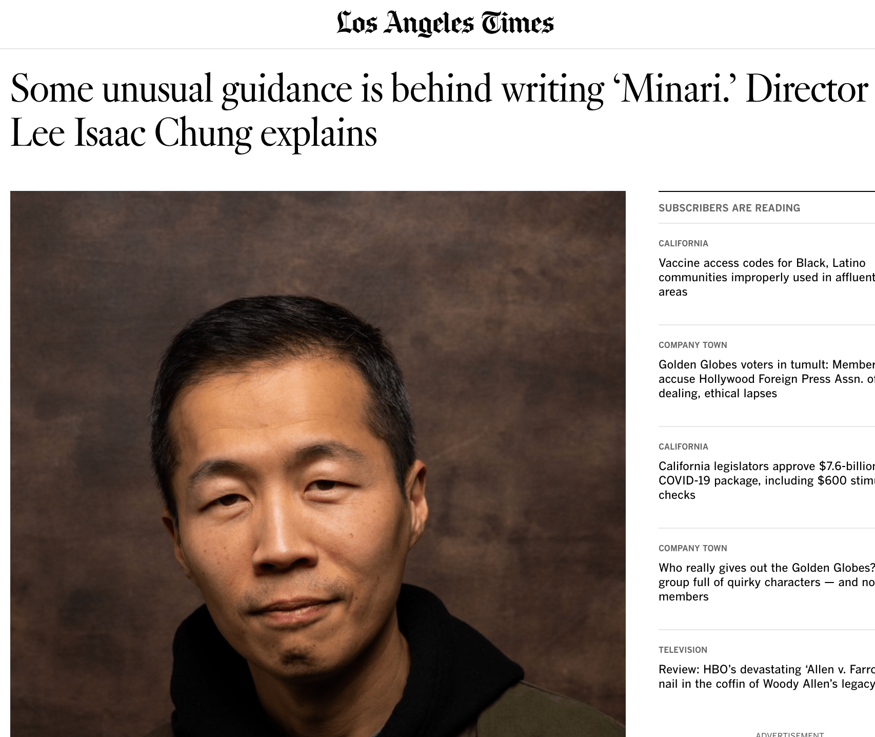 This week in The Los Angeles Times, you can read an article by Lee Isaac Chung, the director of the semi-autobiographical film Minari, about how the vision for the film came to him. Normally, something like this would appear as an interview, but here Chung has taken the time to compose an intimate testimony of a strange and "mystical" experience.