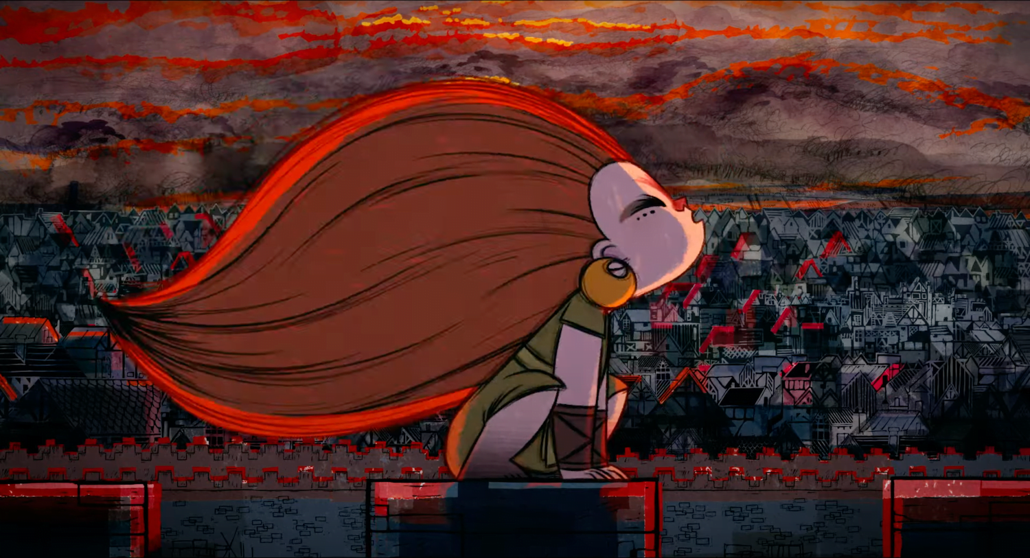 Wolfwalkers follows Robyn Goodfellowe, who has recently moved to Kilkenny with her father, Bill. Bill’s help has been enlisted by the Lord Protector, the English-appointed ruler of the town, whose aim is to tame the surrounding forest and, likewise, the Irish people. The Lord Protector’s rule — and religion — is law and order; anything wild is anathema and accursed. Bill is commanded to eradicate the wolves in the forest, and Robyn, eager to hunt, delves into the forest against her father’s wishes. There she encounters Mebh, a Wolfwalker: a human who can communicate with the wolves and who takes the form of a wolf when asleep.