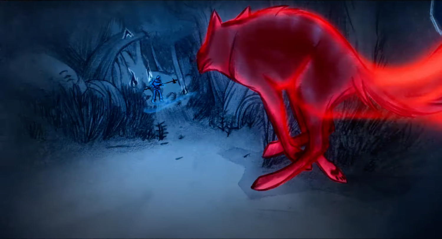 But how to convey what it’s like to be transformed? Just as with any language, different forms are needed to communicate different concepts. In the scenes where the lupine Robyn runs through the forest, far faster and freer than she could in human form, the movie occasionally shifts to her point of view. The landscape darkens, leaving people and animals brightly lit, a trail of scent behind them as they move. As she runs, the background movement staggers a bit, the frames jittery, conveying the strangeness of her speed.