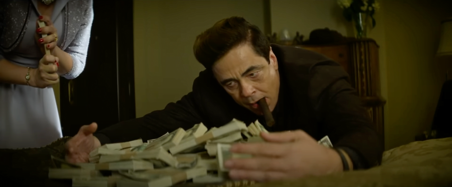 As usual, he seems to have a long line of Hollywood A-listers — aging veterans and fresher faces — eager to work with him, and, with smart casting by Carmen Cuba, he stirs up a spicy stew of stars. They find a cool, easygoing chemistry here, and the secret of their success is that nobody overreaches. ("Overreach," by the way, becomes a very important word in this film.) Every one of the big stars here dials it up to, oh, about 7 out of 10, and that keeps things from feeling too showy, too eager to please, too ambitious for awards. That carefully sustained tone gives the film a convincing cohesion. The ensemble is (with one exception) uniformly strong — Cheadle reveling in his meaty role (one of his greatest performances), Del Toro enjoying playing a fool who catches a few lucky breaks, Harbour leaning into his Desperate Harrison Ford voice, and Fraser making a major impression in what could have been a forgettable role. (He's better than ever. Glad to hear that Scorsese has given him a role in his next film.)