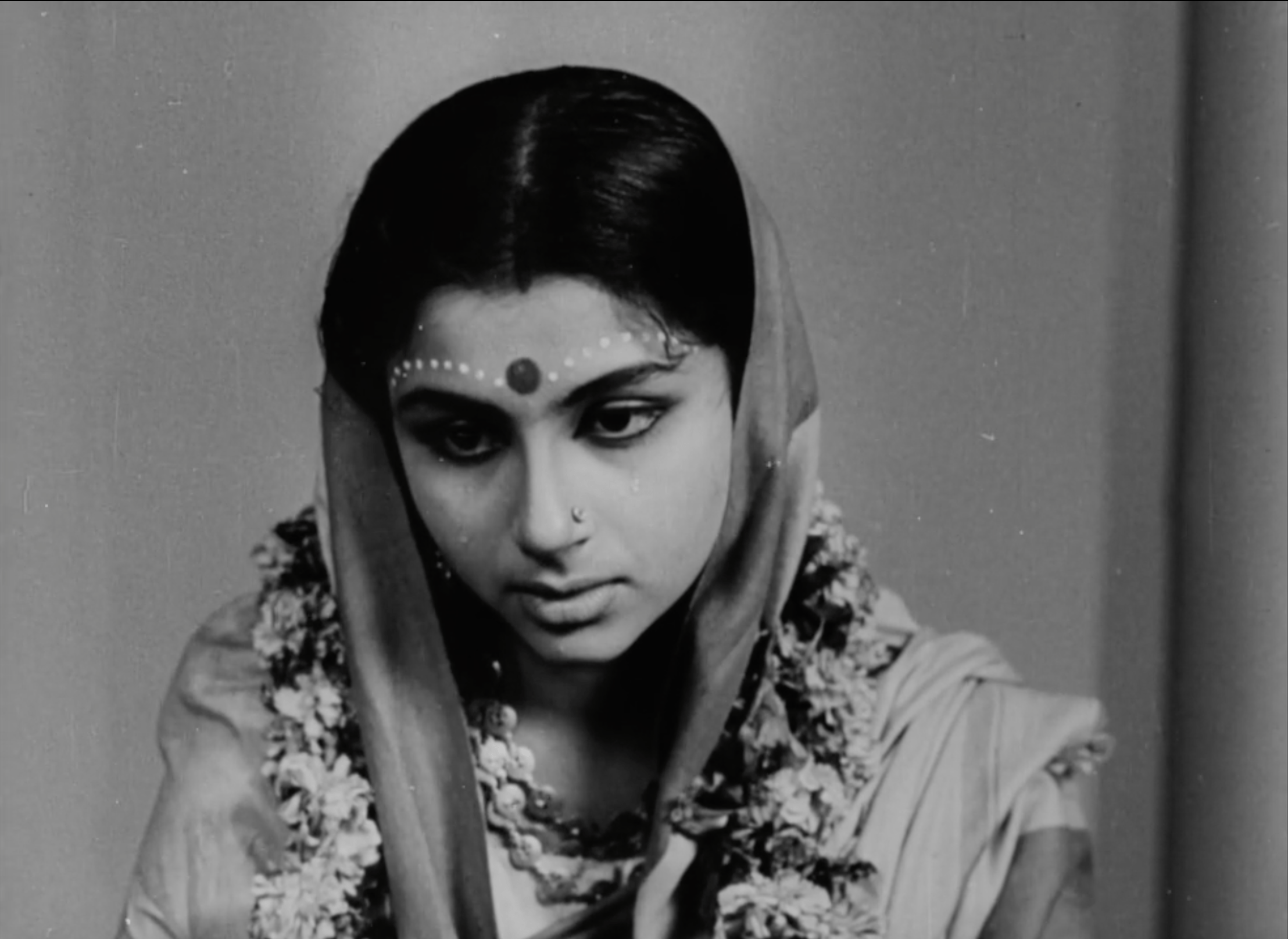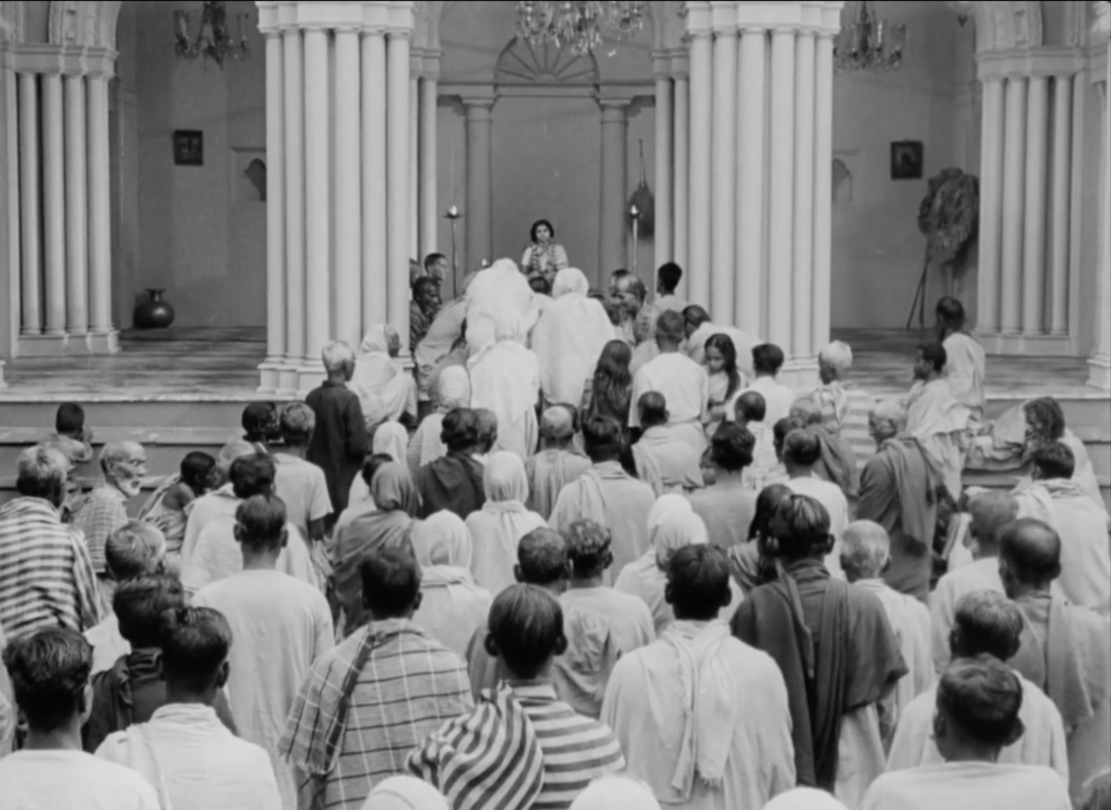 Seriously — though the film immediately immerses me in a context of religious iconography and ritual that I find unsettlingly unfamiliar, I am still drawn in by Ray's love of reverent close-ups and his attentiveness to the intelligence and the emotions of people who speak softly and sparingly. He might have made this a movie that makes fun of the irrational extremes to which religious faith can lead its believers. But instead, by shifting back and forth between the skeptical and troubled gaze of Umaprasad, looking down at his diminutive wife at the center of a ceremonial storm, and the upward-gazing adoration of Umaprasad's awestruck father, he draws us into the complicated silences of Doya, who is both enchanted by the waves of attention and adoration and terrified of where it all might lead.