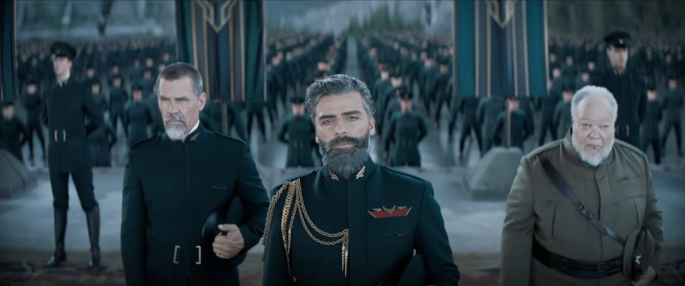 I could praise the cast: Consider Timothée Chalamet makes choices that will be unjustly maligned by audiences who need charismatic, muscular, dramatic heroes. He gives us a Paul with an Edward Scissorhands vibe — he's awkward, quiet, curious, and not at all interested in attention or action. Consider Oscar Isaac manages, in very little screen time, to convince me of Duke Leto's love for Jessica, his deep affection and respect for his son Paul, his sense that he is in over his head as his family is manipulated by the Emperor, his fear for the future of House Atreides. Consider how Rebecca Ferguson makes us feel the danger that Jessica has risked with her controversial partnership and her controversial pregnancy; she gives Paul's mother a fierce intelligence, a believable agility in combat, and a powerful personal anguish. As Gurney Halleck, Josh Brolin makes me fear the wicked Harkonnens more with one line delivery than the Harkonnens can live up to with their run-of-the-mill violence for the rest of the film. As Baron Harkonnnen and his nephew Beast Rabban, Stellan Skarsgård and Dave Bautista are manifestations of ego and brutality, their appetites for power having consumed any fragments of conscience.