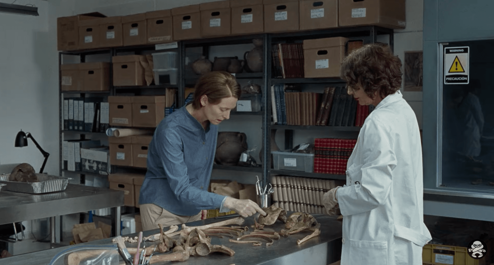 An archaeologist (Jeanne Balibar) invites Jessica into a restricted lab to show her bones unearthed during a deep-earth tunneling project, bones that include a skull with a mysterious puncture — a remnant of a ritual that was carried out to "release bad spirits." This gives us another thread to track through the film: the opening of cavities in people, in the earth, and in the spirit world in ways that might be unleashing transformative forces.