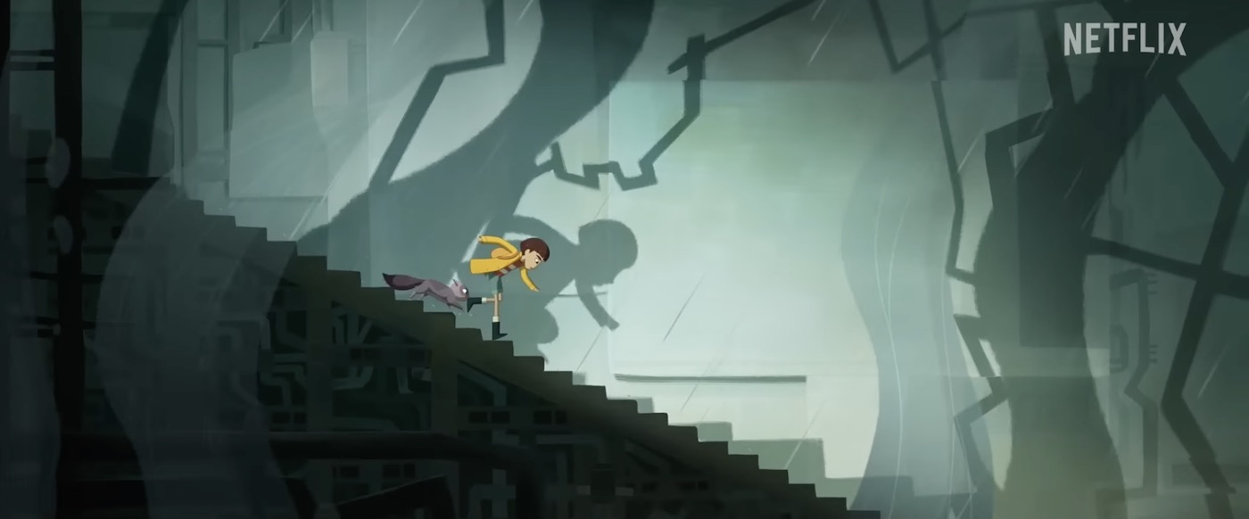 So Dela, putting up quite a show of optimism, packs up and gambles on a new start in the metropolis of Nevergreen, where everything is crowded, chaotic, and dangerous. Their new apartment is alarmingly unfurnished, the plumbing seems to have been installed by a prankster, and the scowling landlady is not impressed that Dela has a child in tow. When she impresses upon them that no pets are allowed, well... you can tell where this is going. Sure enough, it takes about five minutes of screen time before the inevitable cat shows up.