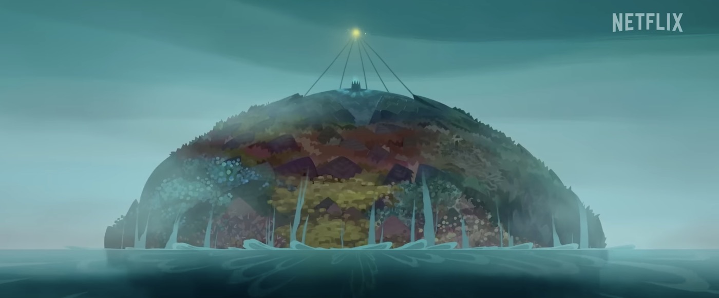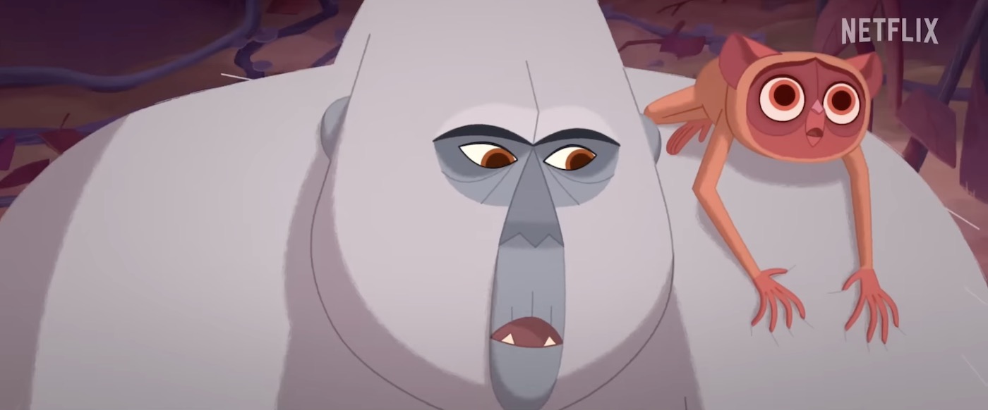 Wild Island is not a desert island, but its extravagant colors make it look like... a dessert island, perhaps? Still, it's hardly an ideal vacation destination. Not only is it overrun with aggressive and unnerving animals, but it tends to start sinking into the sea every so often, and those pesky critters need someone to step up and save them somehow. In this situation, a big white ape named Saiwa (voiced by Ian McShane, so we know he's the villain) seems to be in charge, having bound a flying dragon named Boris (Stranger Things' Gaten Matarazzo) to tethers and basically enslaved him to do the literal Heavy Lifting.
