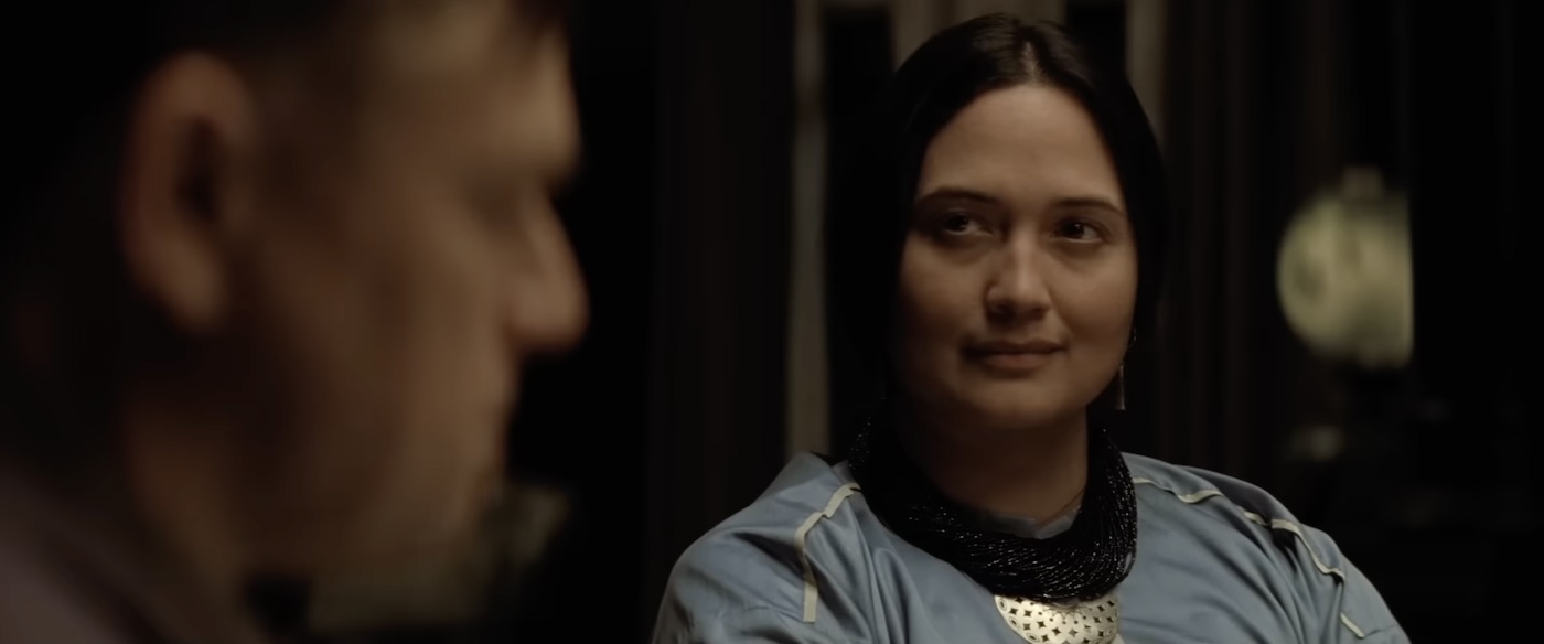 The most obvious of the villains is probably clear to us through casting alone: De Niro plays Sheriff Hale as a charismatic politician with all the right (and the “Right”) religious vocabulary, feigning Christian conviction while pulling strings to rob the Osage blind. And he’s good enough at this game that Osage elders honor him as a champion of their cause, even relying on his resources to seek out those responsible for the “epidemic” of murders in their community.