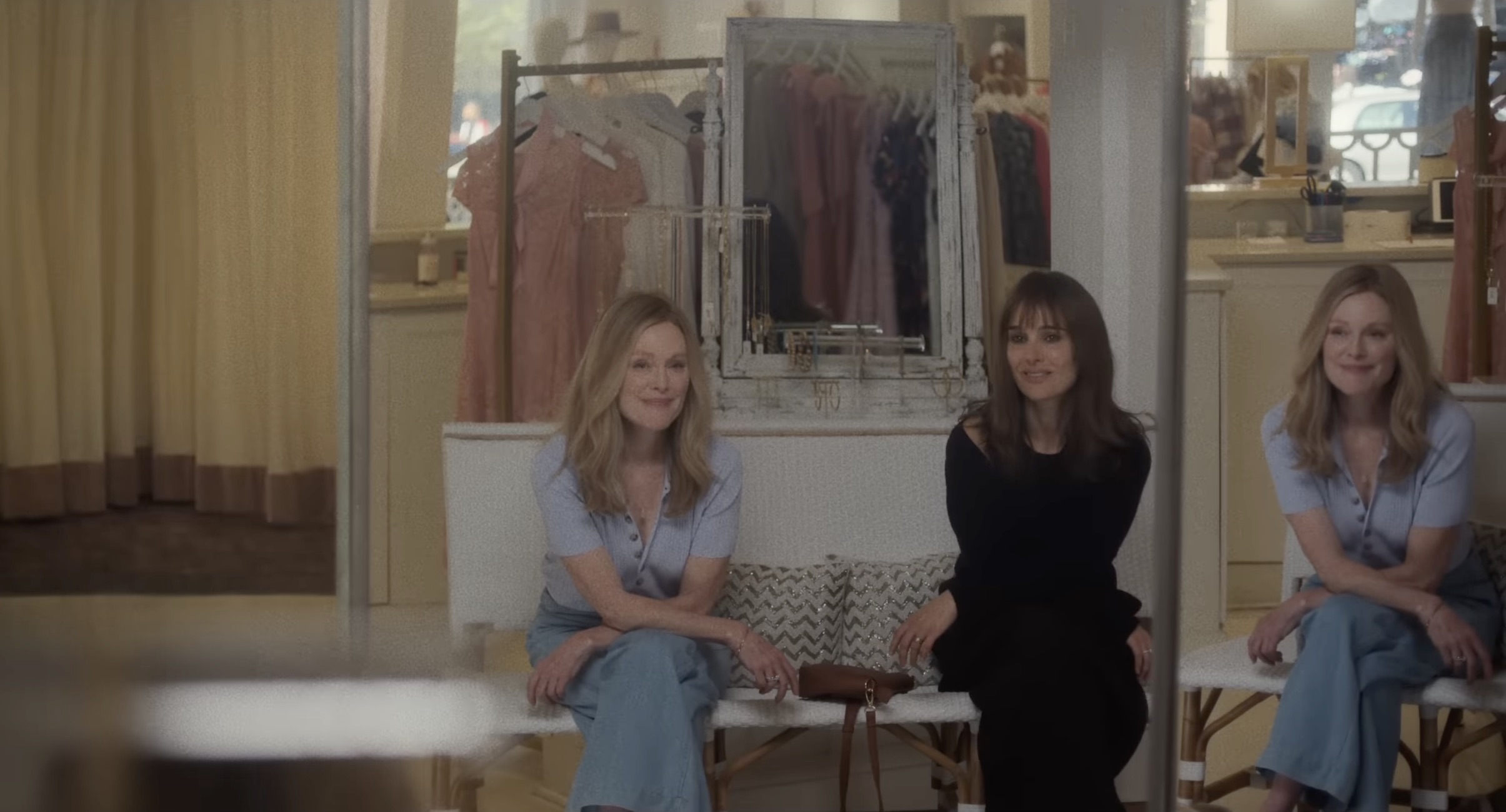 In what may be my favorite scene of 2023, Gracie watches one of her daughters try on dresses for a formal event, and she cannot resist making passive-aggressive comments that expose her disapproval — not her disapproval of the dresses, but of her daughter’s body. Meanwhile, Elizabeth pays strict attention to Gracie’s body language, mimicking until she’s like a mirror image of Gracie, modeling the surface while evincing no objection to the implications of Gracie’s behavior. I couldn’t help but think of how this scene, like the scene in Sofia Coppola’s Priscilla when Elvis critiques his underaged dream girl’s preference in dresses, makes obvious allusions to Hitchcock’s famous department store scene in Vertigo. What’s more, I think this scene is choreographed brilliantly in front of multiple mirrors to tease us with questions about who is being genuine, who is pretending; who is real, and who is just a reflection. It’s the best trick shot with mirrors I’ve seen since one involving Adam Driver and Golshifteh Farahani in Jim Jarmusch’s Paterson, and this one is far more complicated than that.