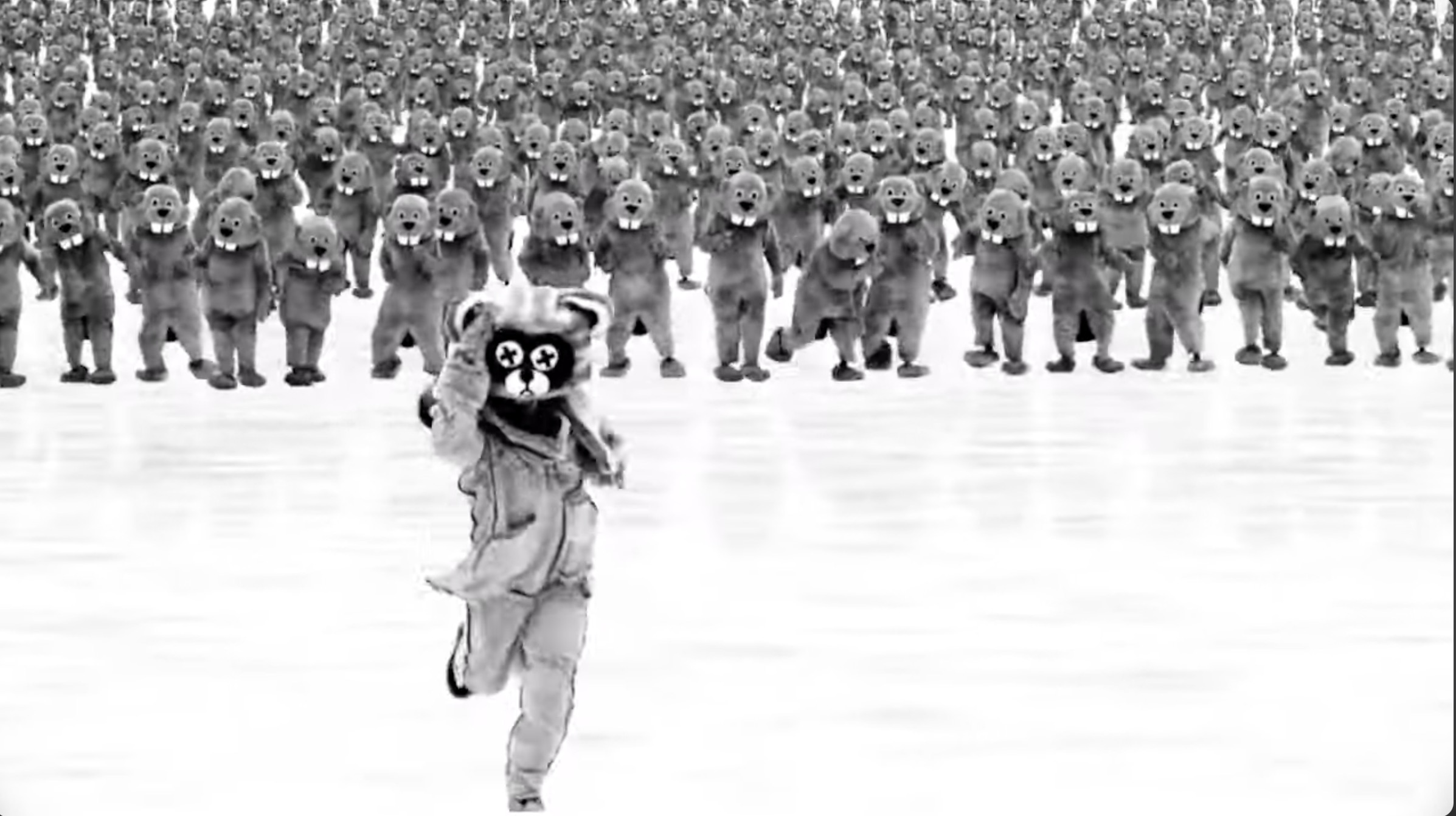 I had stumbled onto the promo for Hundreds of Beavers on YouTube, and it made me laugh. Then it made laugh again. I leaned forward, intrigued. Somebody had gone to a lot of work to create startling images while also adhering to strict limitations. Who would do this? Who would go to the trouble to dress up actors in goofy animal costumes—costumes that might be mascots for a high-school football tournament featuring the Rabbits, the Raccoons, the Wolves, and, of course, the Beavers—and film a live-action Looney Toons cartoon in a snowbound forest?