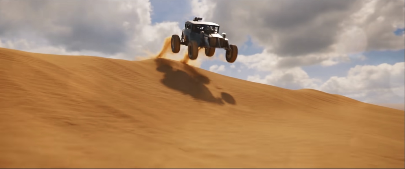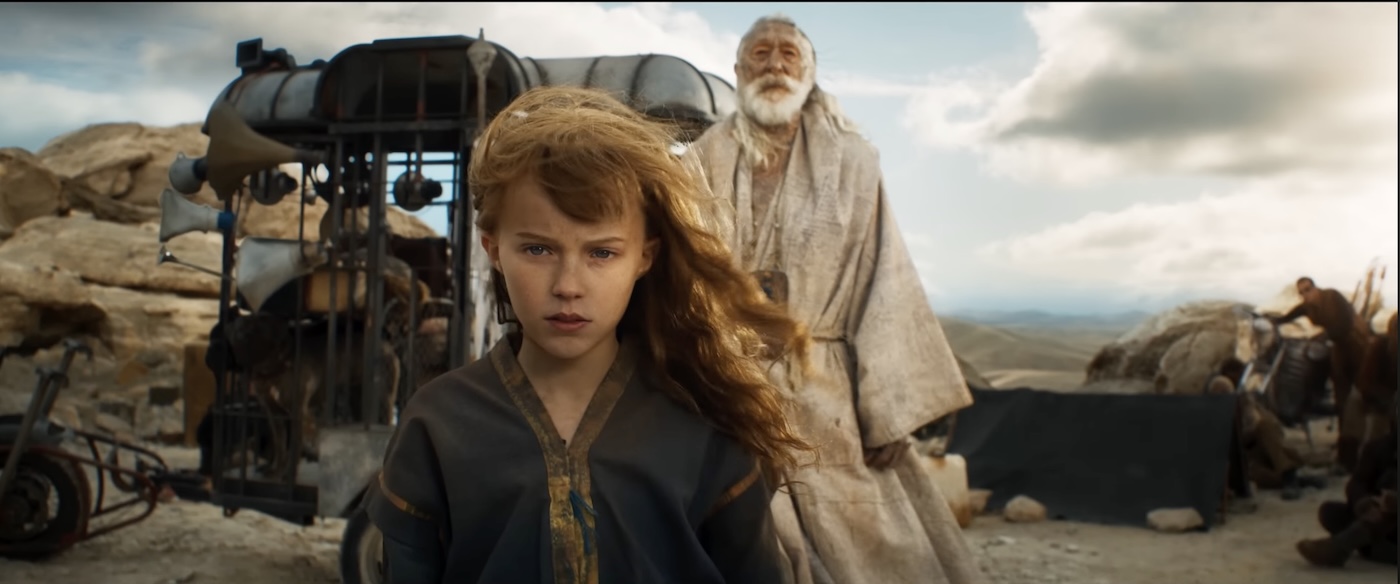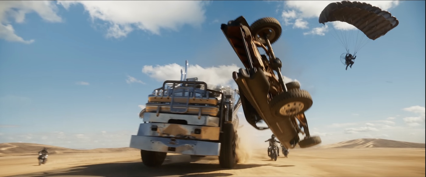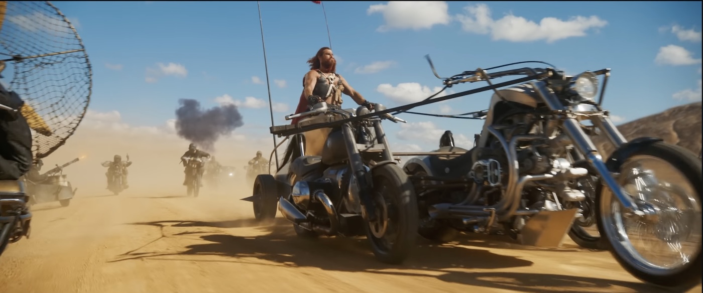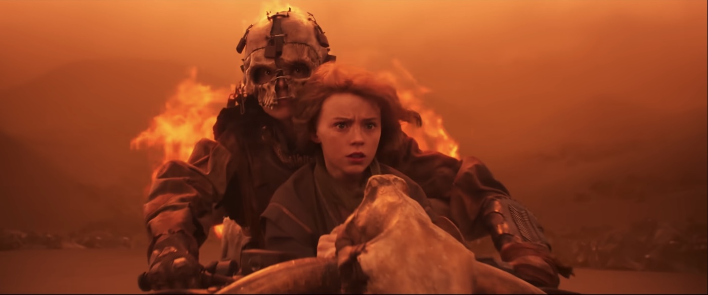 But when we realize that this prequel focuses on a much younger Furiosa, it makes sense that Miller chose 13-year-old Alyla Browne and the ubiquitous Anya Taylor-Joy to represent the character’s journey from early childhood to young womanhood. (Digital animation is employed here very cleverly, trying to make the handoff from Browne to Taylor-Joy seem seamless.) To my surprise, it’s easy to suspend disbelief and accept these two as the earlier versions of Theron’s character. Much of that has to do with Taylor-Joy’s full-bodied commitment to suffering Furiosa’s ordeals, developing her physical prowess, and convincing us that she can drive like a bat out of hell. (Perhaps you’re old enough to remember the thrill of seeing Indiana Jones maneuver beneath a truck that was running at high speed on a dirt road. Wait until you see what Furiosa can do in similar circumstances!)